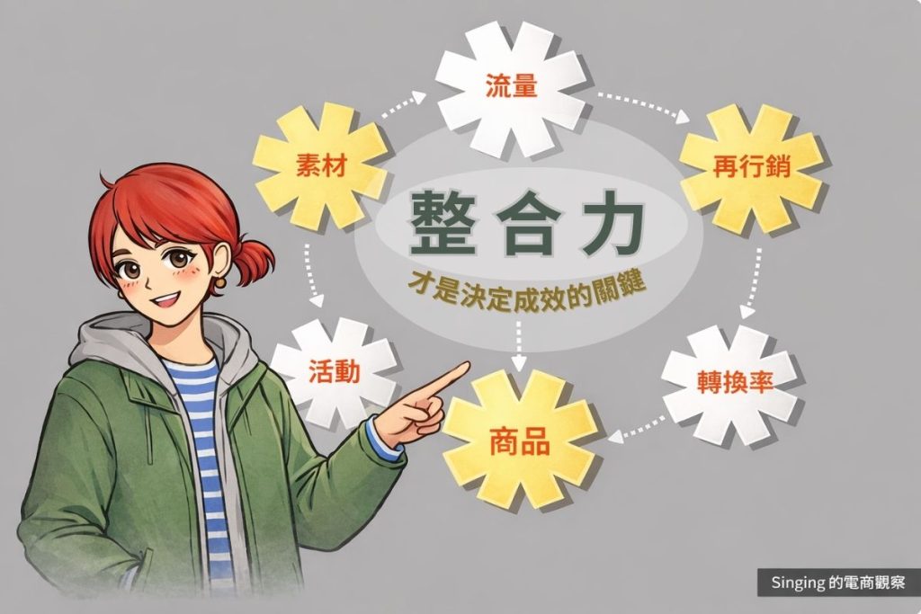 活動 × 轉換 × 素材 × 商品 × 再行銷 × 流量這些東西一起發揮作用的能力。